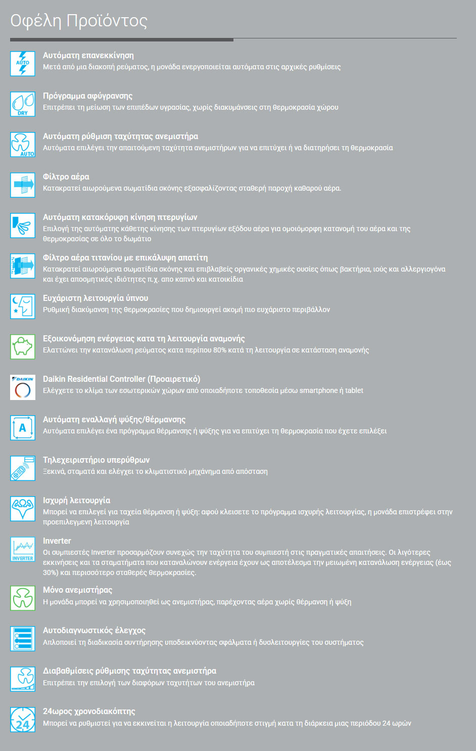 - Οι εξωτερικές μονάδες της Daikin είναι εξοπλισμένες με έναν εναλλάκτη θερμότητας με αντιδιαβρωτική επεξεργασία (μπλε πτερύγιο), ο οποίος εξασφαλίζει μεγαλύτερη αντοχή στις πιο αντίξοες καιρικές συνθήκες